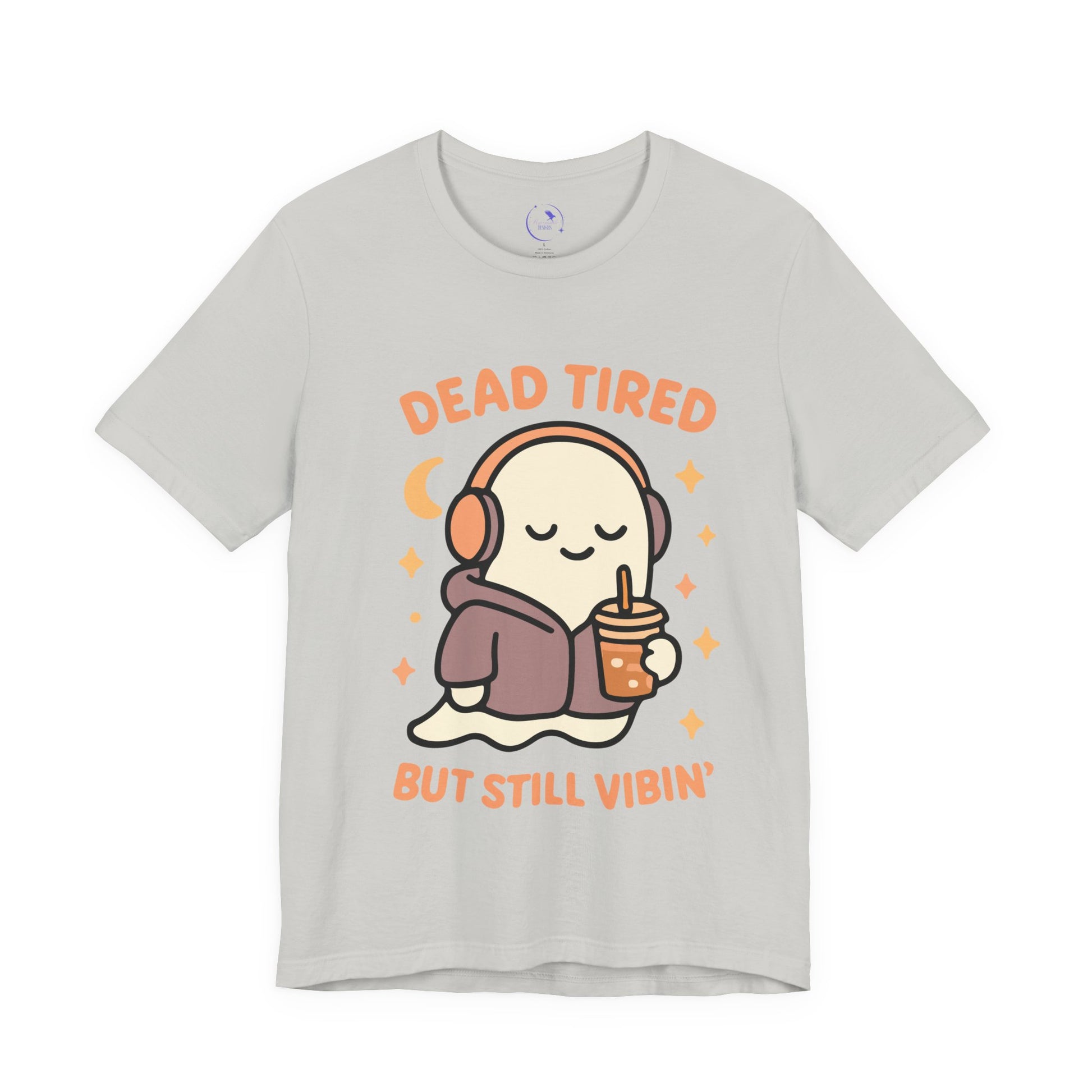This funny and cute ghosts vibing T-shirt is the perfect apparel for Halloween. The humorous Dead Tired design adds a lighthearted touch to your wardrobe, making it a fun conversation starter. It is relevant to those who enjoy Halloween celebrations and appreciate a good pun.