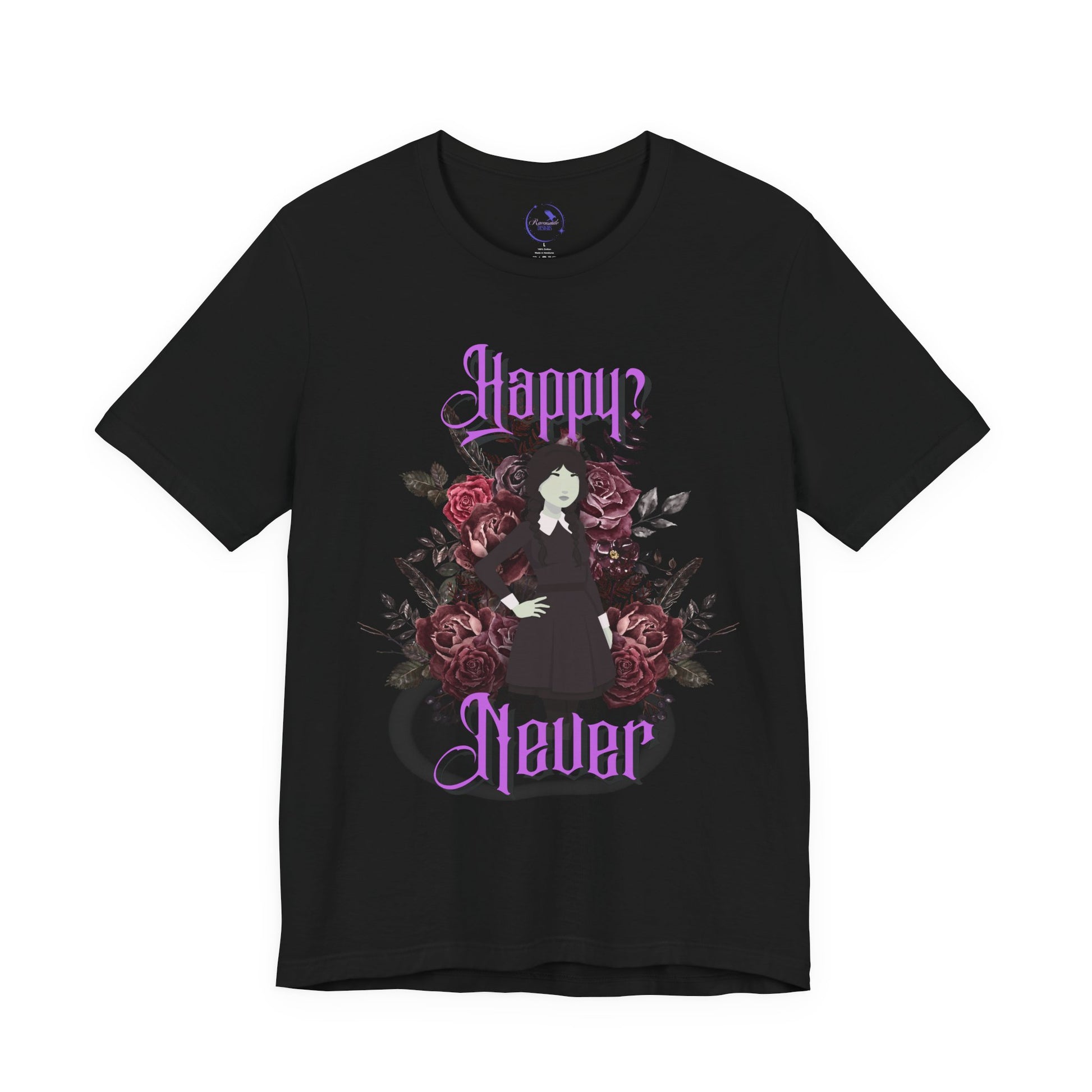 Ideal for art lovers, goth enthusiasts, or anyone with a unique flair, this tee can be worn on Halloween, quirky birthday parties, or just as an everyday go-to. Its eye-catching design boldly states, "Happy? Never," adding a fun twist to your outfit. Celebrate your personal style with this must-have piece that resonates with confidence and creativity.
