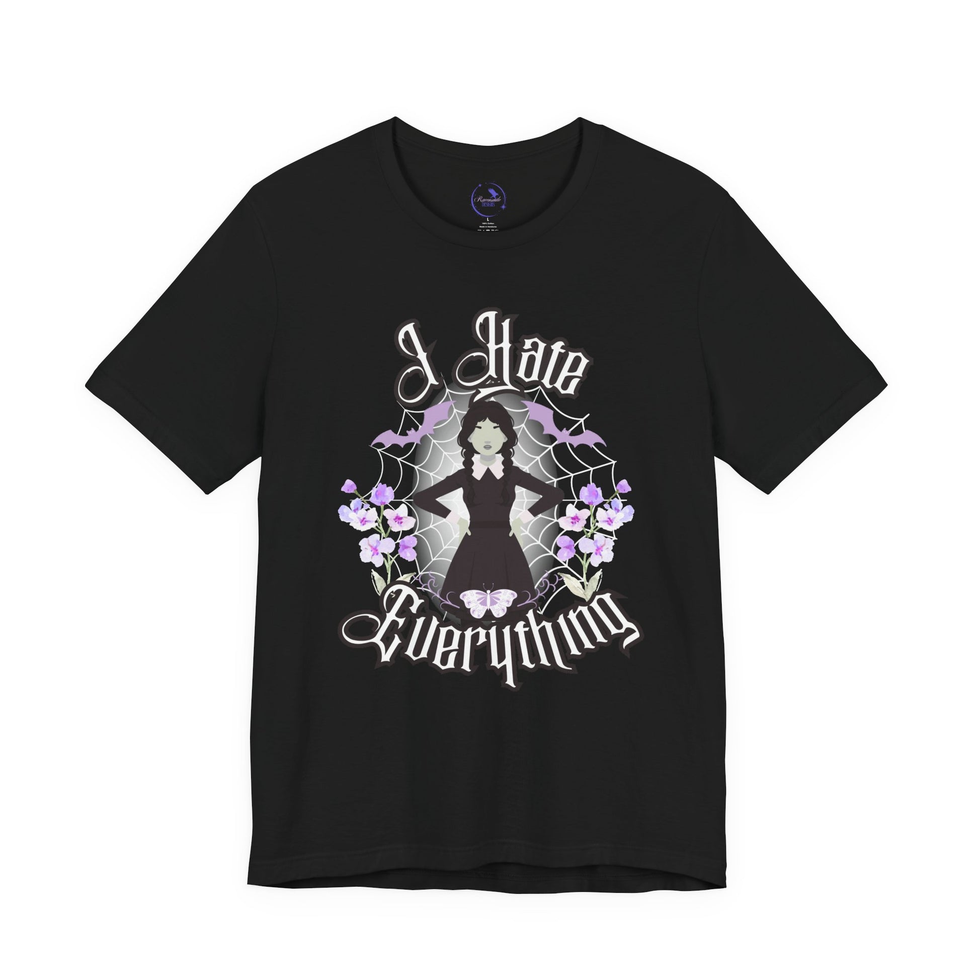 Ideal for art lovers, goth enthusiasts, or anyone with a unique flair, this tee can be worn on Halloween, quirky birthday parties, or just as an everyday go-to. Its eye-catching design boldly states, 'I Hate Everything', adding a fun twist to your outfit. Celebrate your personal style with this must-have piece that resonates with confidence and creativity.